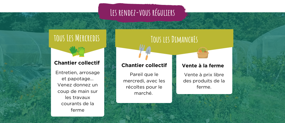 Des rendez-vous réguliers autour de la ferme et la production de légumes (chantiers collectifs, marché à la ferme…)